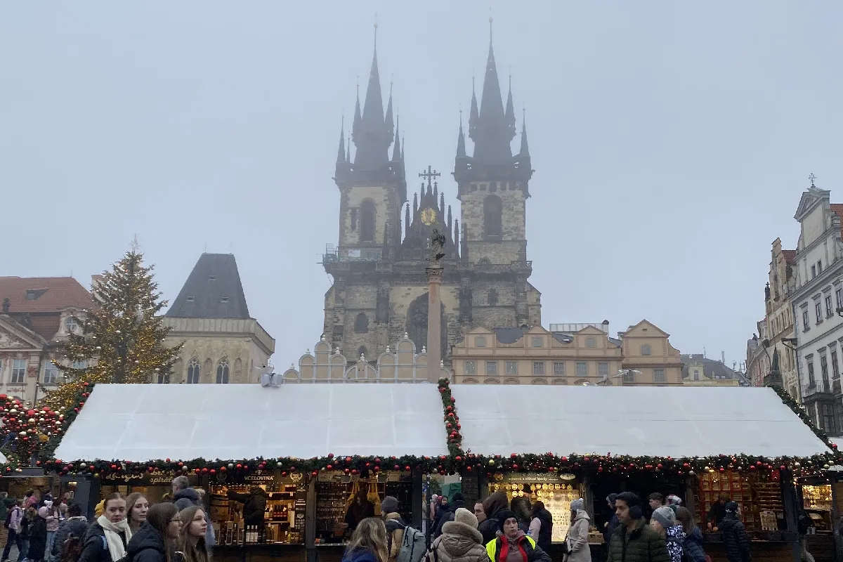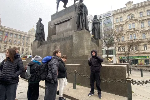 Rolí průvodců po Královské cestě se ujali studenti ruského jazyka, kteří si připravili k jednotlivým památkám krátké referáty. Nejdříve vyprávěli o památníku sv. Václava na Václavském náměstí, Obecním domě a Prašné bráně. Poté jsme navštívili Staroměstské náměstí, kde jsme se při procházce vánočními trhy dozvěděli zajímavé informace o Týnském chrámu, památníku Jana Husa a Staroměstské radnici s orlojem. Procházku jsme ukončili na Karlově mostě, ze kterého jsme měli hezký výhled na Pražský hrad s Chrámem sv. Víta.