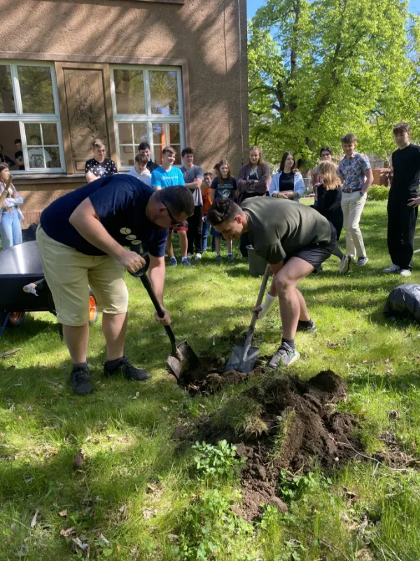 Během čtvrté hodiny jsme na školní zahradě společně zasadili ovocný strom jako symbol růstu a péče o budoucnost. Následovala hromadná fotografie všech studentů a učitelů, která krásně zachytila atmosféru dne.