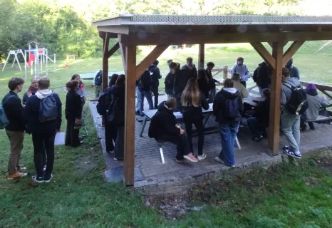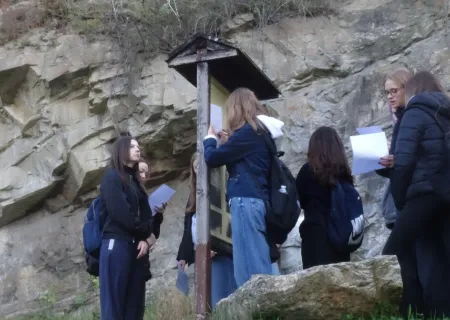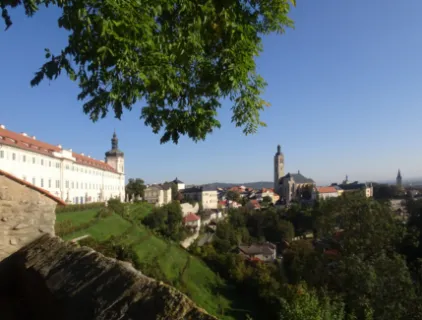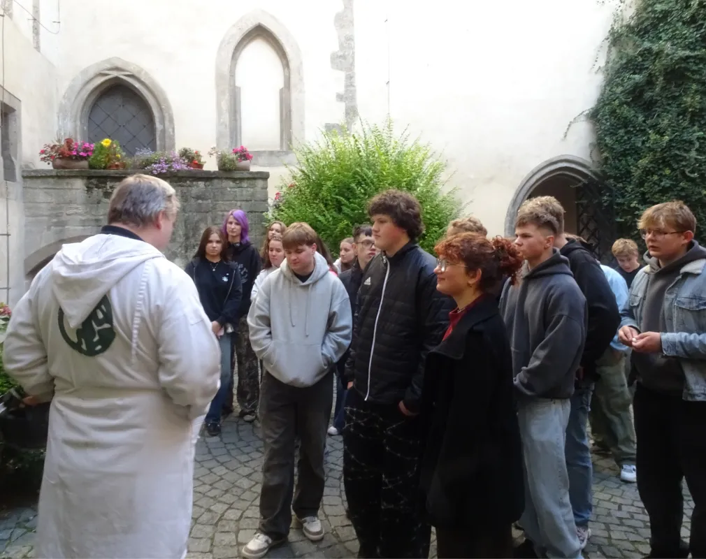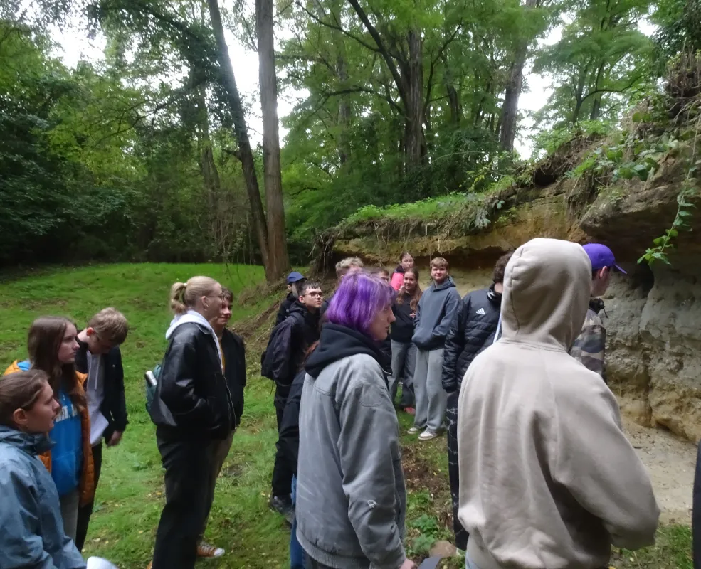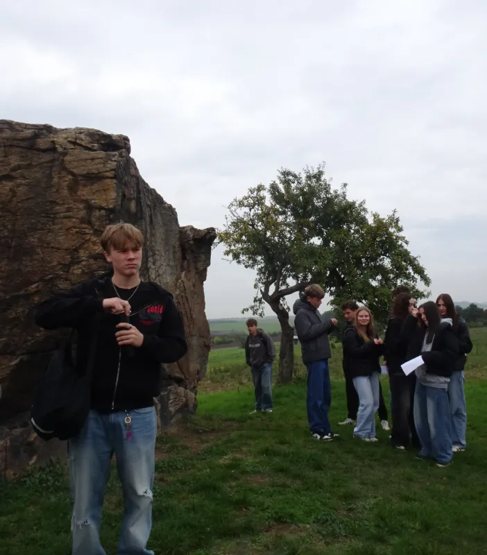 V úterý 30. září jsme se vydali na exkurzi do Kutné Hory, kde na nás čekal pestrý program plný zajímavostí z geologie i historie. Nejprve jsme navštívili Geologickou expozici Čížkova skála, která se nachází v bývalém lomu na okraji města. Místo samo o sobě je geologickou raritou – setkávají se zde totiž křídové vrstvy se starším kutnohorským krystalinikem. Prošli jsme si areál s velkými kamennými bloky z různých míst Kolínska, Kutnohorska i Vysočiny a vyplňovali pracovní list zaměřený na horniny, jejich strukturu a vznik.