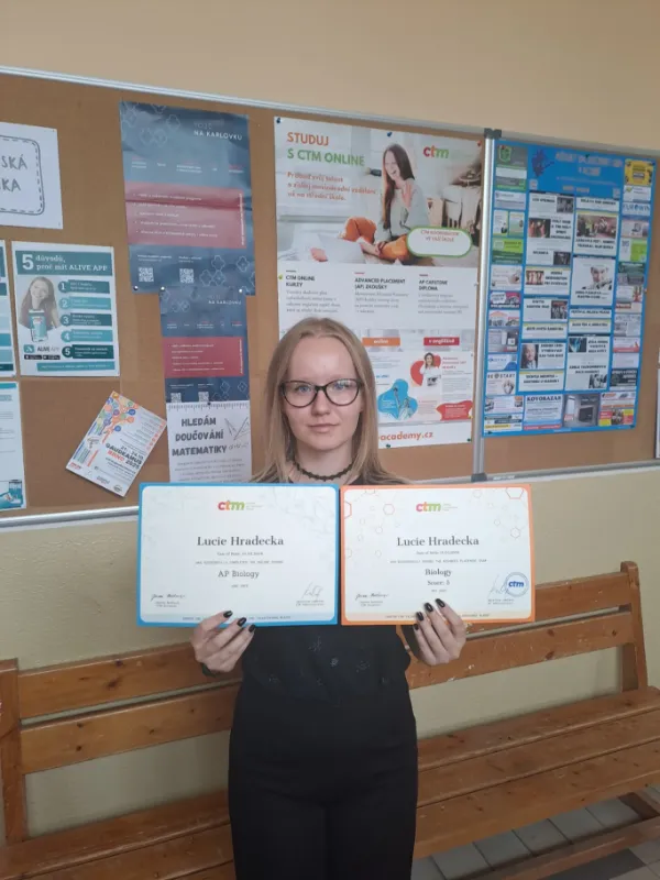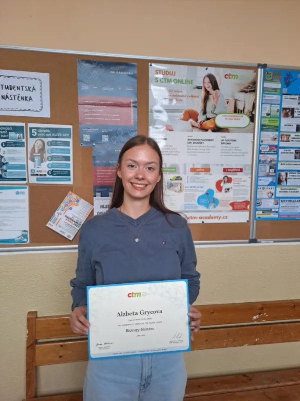 Tento týden jsme měli tu čest předat certifikáty našim žákům, kteří úspěšně dokončili online kurzy Centra pro talentovanou mládež (CTM). Kurzy probíhají v angličtině a studenti si vybírají předměty podle svých zájmů i budoucího studijního zaměření.