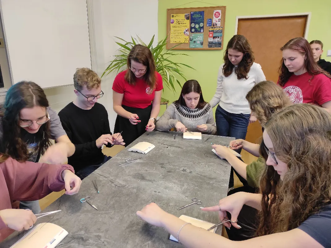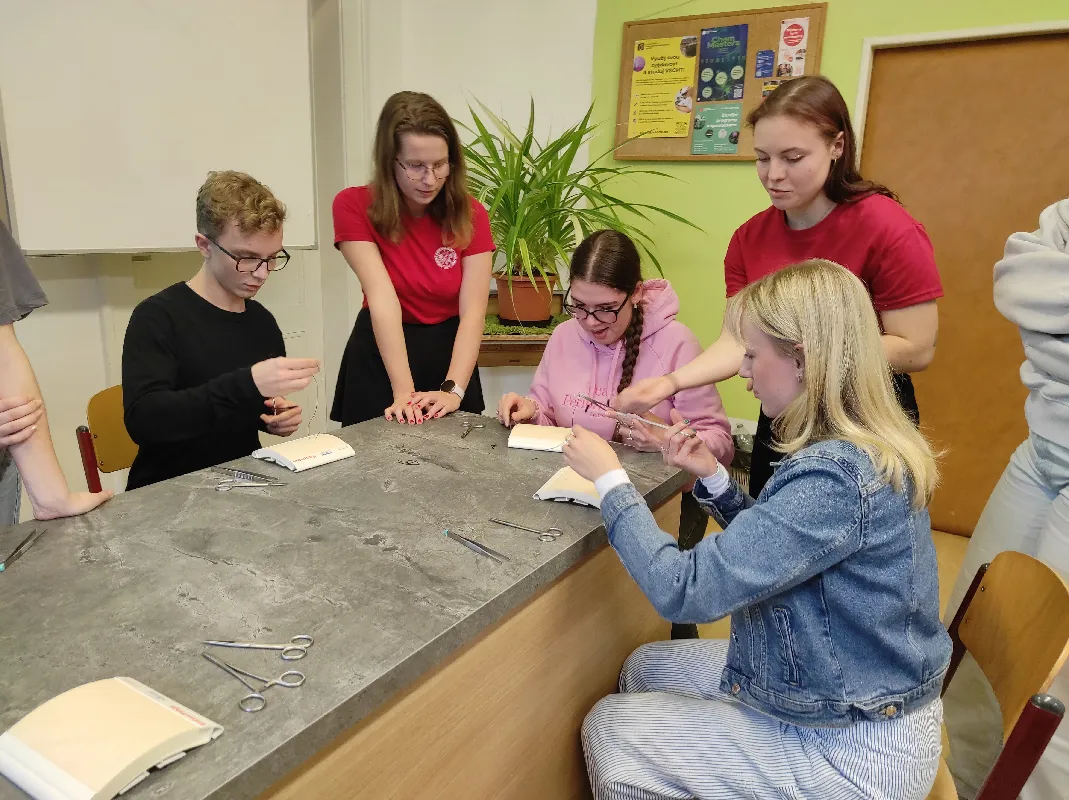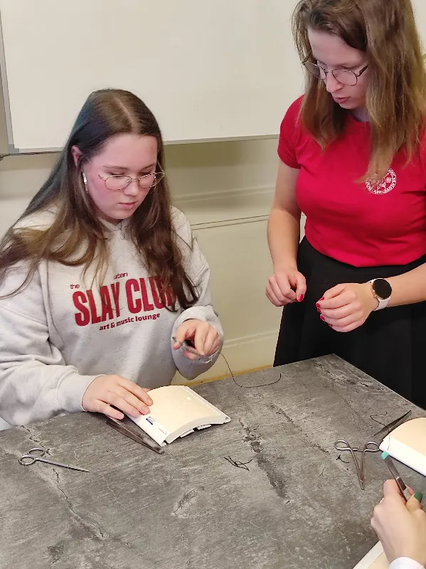 Ve druhé části semináře měli naši studenti možnost seznámit se se základy chirurgického šití ran a vyzkoušet si základní stehy na modelech lidské kůže.